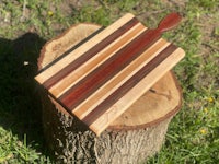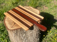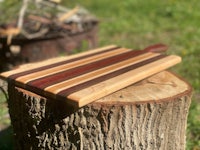 The Waco is a beautiful charcuterie board made from African Padauk, Cherry ,Ash, and Walnut. You can see how beautifully the Padauk is accented by the Walnut! Plus, the Cherry will mature into a pretty caramel color.